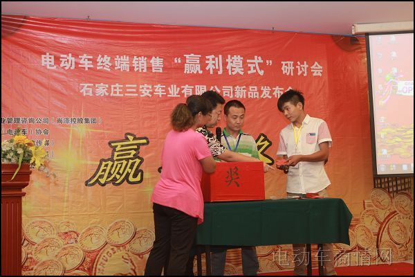 最后石家庄三安车业现场推出了订车大优惠,经销商积极响应,报名踊跃,现场就有很多经销商交定金,形势喜人,并伴有抽奖活动,各地经销商跃跃欲试,逐个参与,奖品诱人。随着热情的音乐和经销商热情洋溢的笑语中本次三安车业“电动车终端销售(盈利模式)研讨会”圆满成功!!